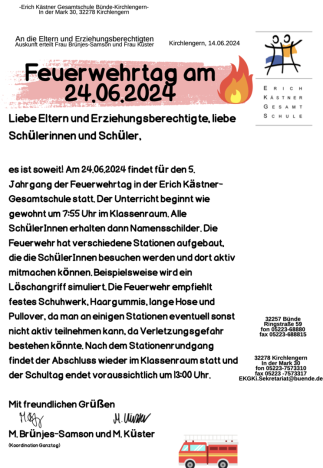 Am Montag, den 24. Juni 2024 fand für die Schülerinnen und Schüler der 5. Klassen der Gesamtschule in Kirchlengern wieder der jährliche Feuerwehrtag statt. An diesem Tag lernen die Kinder alles,