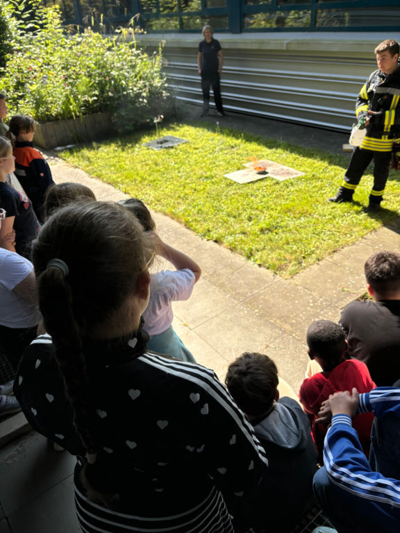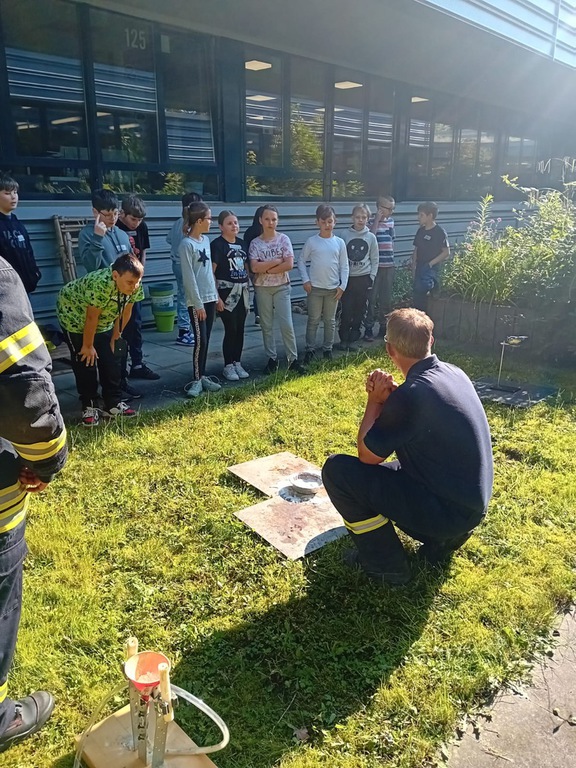 simuliert, der den Fünftklässlern zeigte, wozu die Feuerwehr in der Lage ist. Wichtigste Regel: Falls einmal ein Feuer ausbrechen sollte, gilt es, Ruhe zu bewahren und sich selbst nicht in