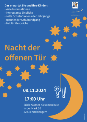 an der Erich Kästner-Gesamtschule in Kirchlengern findet am Freitag, den 08.11.2024, die Nacht der offenen Tür statt.