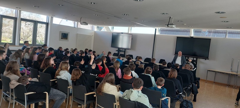Zurück im Rathaus wartete ein besonderes Highlight: Bürgermeister Rüdiger Meier nahm sich Zeit, stellte sich persönlich vor und beantwortete die vielen neugierigen Fragen der Schülerinnen und
