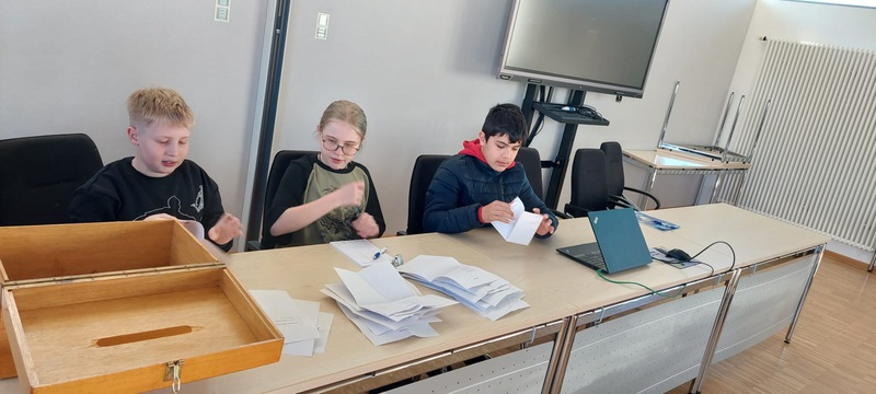 Im Mittelpunkt stand eine realitätsnahe Simulation der Kommunalwahlen. Drei Schülerinnen und Schüler übernahmen die Rolle der Wahlhelferinnen und Wahlhelfer und unterstützten tatkräftig beim
