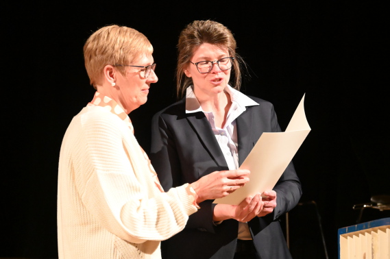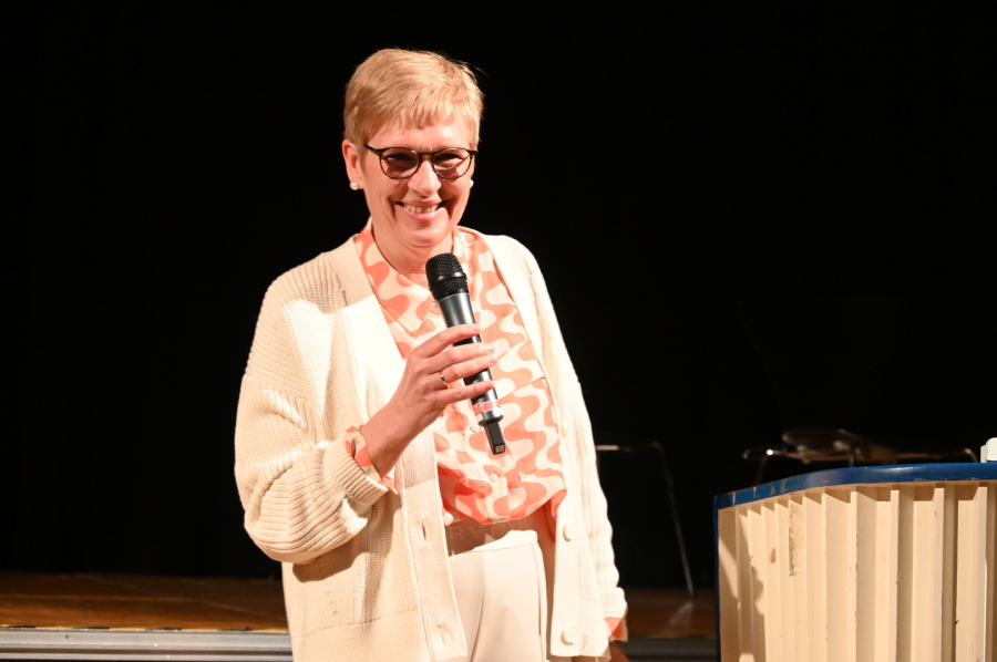 Das Verabschiedungsprogramm startete mit einem künstlerischen Beitrag der Poi-Gruppe. Die Darstellung leitete vielversprechend in den weiteren Ablauf ein. Anschließend begrüßte Dennis Krause, neuer Schulleiter der EKG, Antje Stuke, ihre Familie und die Gäste, die das Forum der EKG Bünde füllten. Er gab einen kurzen Einblick in die Vita Stukes, die im Verlauf der Verabschiedung immer wieder aufgegriffen wurde. 28 Jahre war Stuke Mitglied des Kollegiums an der EKG, zunächst als Studienrätin mit Klassenleitung, ab 2007 als didaktische Leitung und im Jahr 2012 trat sie die Stelle als Schulleiterin an. „Danke, dass du Mensch warst und wir alle Mensch sein durften“, sagte Krause und sprach im Namen des gesamten Kollegiums. Krause übergab das Wort anschließend an Heike Delker, Dezernentin für die Gesamtschulen im Bezirk Detmold, die Stukes beruflichen Werdegang detailliert wiedergab, aber auch Anekdoten aus den Schulleitersitzungen und weiteren Schulsituationen humorvoll preisgab. Delker stellte heraus, dass Stuke eine besondere Persönlichkeit darstelle, die die individuelle Förderung an der EKG maßgeblich förderte. Schon als Lehrerin entwickelte Stuke federführend das Konzept des Gemeinsamen Lernens. Zudem leitete sie die erste Klasse des Gemeinsamen Unterrichts. „Du hast diese Schule über 28 Jahre mit deiner besonderen Persönlichkeit geprägt und mit deinem Team zu einem Ort des Gemeinsamen Lernens und der individuellen Förderung gemacht“, hob Delker Stukes Arbeit im besonderen Maße hervor.