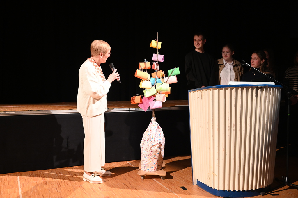 Ralf Wiegmann, Schulpflegschaftsvorsitzender der EKG, las anschließend unter anderem aus einem Zeitungsartikel vom 13.01.2012 vor, der Tag, an dem Stuke Schulleiterin wurde. In der örtlichen Presse wurde folgendes Zitat von Stuke aufgegriffen: „Ich bin nicht so wichtig, die Schule ist wichtiger“. Wiegmanns Redebeitrag schloss sich ein Instrumentalstück mit der Klarinette von Tim Niederstadt aus der Q2 an, der vom Musiklehrer Marcus Linnemann auf dem Kladrei begleitet wurde. Darauf folgten Redebeiträge des Schulleitungsteams und der Schülervertretungen beider Standorte. Das Schulleitungsteam hob die Menschlichkeit Stukes in den Vordergrund. Schülervertreter*innen des Standorts Bünde übergaben Stuke einen Apfelbaum mit Wünschen seitens der Schülerschaft. Vom Standort Kirchlengern gab es selbst verfasste Wünsche für die Zukunft Stukes. Beide Schülerschaften bewunderten Stukes Arbeit und stellten heraus, dass das Engagement und die Wertschätzung, aber auch die „netten Pläuschchen“ mit den Schüler*innen seitens ihrer ehemaligen Schulleiterin nicht selbstverständlich gewesen seien.