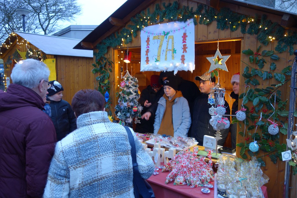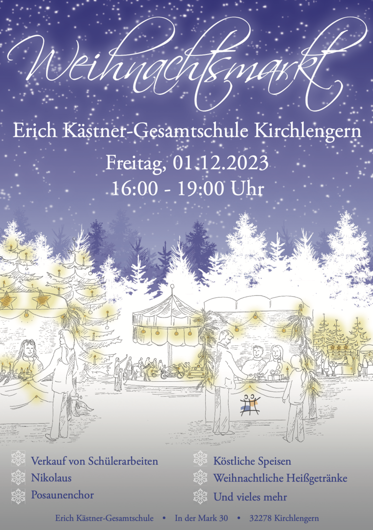 Alljährlich Ende November wird in den Klassen- und Fachräumen der Erich Kästner-Gesamtschule gebastelt, gewerkelt, gebacken und gekocht. Die Projekttage am 29. und 30.11. fanden auch 2023 wieder in vorweihnachtlicher Atmosphäre statt. Die Schülerinnen und Schüler wurden hierbei nicht nur von ihren Lehrkräften unterstützt. Auch viele Eltern und Verwandte engagierten sich mit ganzer Kraft von vollem Herzblut bei der Herstellung der Schülerprodukte sowie beim Verkauf wohlschmeckender Kuchen- und Suppenkreationen auf dem Schulweihnachtsmarkt, der am 1. Dezember stattfand. Besondere Highlights waren auch dieses Mal wieder der Besuch des Weihnachtsmannes, der mit einem Feuerwehrauto auf den Schulhof gebracht wurde, sowie der Posaunenchor, der einige weihnachtliche Musikstücke zum Besten gab. Trotz fröstelnder Atmosphäre bei knapp -2 Grad kamen wieder eine Menge Besucherinnen und Besucher zusammen – allen voran eine Vielzahl an ehemaligen Schülern und Lehrkräften, die ihrer ehemaligen Schule einen Besuch abstatten wollten und mit der aktuellen Schülerschaft ins Gespräch kamen. Der nächste Schulweihnachtsmarkt findet voraussichtlich am 29. November 2024 statt.