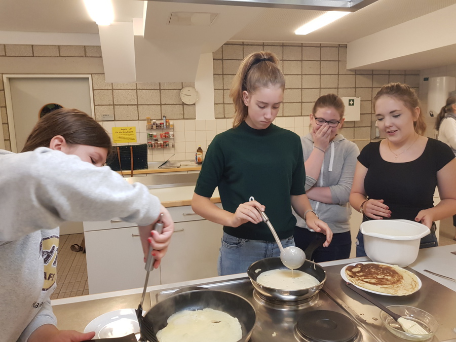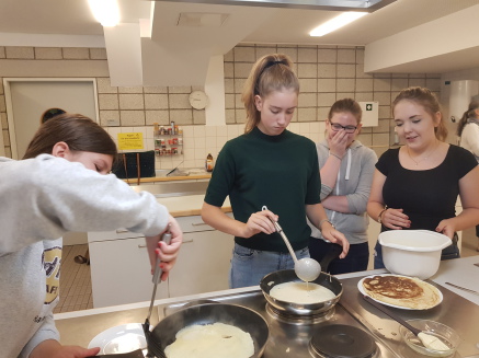 Am Mittwoch trafen sich alle an der EKG in Bünde, um zusammen in gemischten Kleingruppen Crêpes nach der Anleitung eines zweisprachigen Rezeptes zu machen.