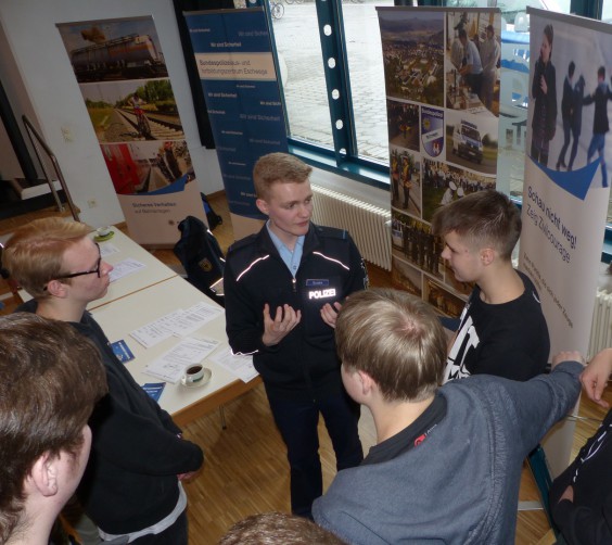 Unternehmen aus Wirtschaft und Industrie – nicht nur aus Kirchlengern – präsentierten sich hier anschaulich der Schülerschaft aus den Jahrgängen 8 – 10. Die Messe bot Schülern und Betrieben die Möglichkeit, sich gegenseitig kennenzulernen und Kontakte zu knüpfen, um den Übergang von der Schule in das Berufsleben zu erleichtern. Neben vielen mittelständischen Unternehmen aus Kirchlengern war auch ein ehemaliger Schüler der EKG, der sich für einen Ausbildungsplatz bei der Bundespolizei qualifizieren konnte, mit einer Abordnung aus dem hessischen Eschwege angereist und präsentierte sehr vielen interessierten Schülern sein Tätigkeitsfeld.
