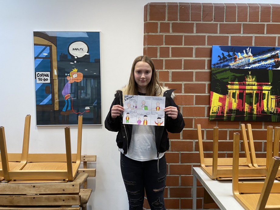 Pina Barciaga aus der Klasse 8a und Evelin Pazula aus der Klasse 10a haben im Rahmen des Französischunterrichts neben Corona, Homeschooling und Unterricht am bundesweiten Wettbewerb des KLETT – Verlags „La vie en BD“ teilgenommen. Aufgabe war, ein Comic zum Thema „L’erreur- der Fehler“ zu kreieren. Die einzige Auflage war, dass der Comic in französischer Sprache geschrieben sein musste und dass er max. eine DIN A3 Seite lang sein durfte. Zu gewinnen gibt es ein Grafik-Tablet, ein Comic-Zeichenprogramm für PC & Mac, ein Zeichenmaterialpaket und Buchpreise.