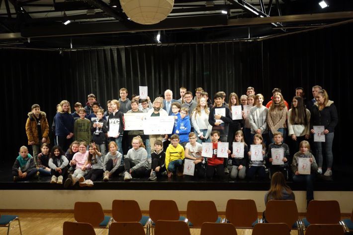 Forum der Erich Kästner-Gesamtschule Kirchlengern die Urkunden für den diesjährigen Volkslauf „Gesund beginnt im Mund“ an die teilnehmenden Schülerinnen und Schüler verliehen. Geehrt werden neben den
