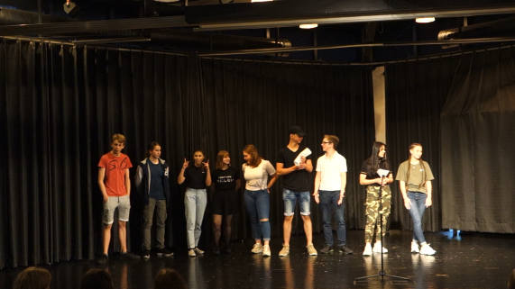 Aufgrund der vielen guten Texte – die Finalisten waren ja bereits von den Schülerinnen und Schülern zu den jeweils besten ihrer Kurse auserkoren worden – war es am Ende für das Publikum und die Jury schwierig, die Gewinner auszuwählen. Den Publikumspreis für den originellsten Slamtext gewann am Ende Antonia Hoch (Klasse 9c) für ihren Text mit dem Titel „An mein jüngeres Ich“. Als Sieger der Lehrerinnenjury konnte sich Jeremy Samuel Bigga (Klasse 9a) feiern lassen, der mit seinem Text „Anthropozän, Geld, Politik und die Welt“ sowohl Publikum als auch Jury überzeugen konnte und damit gewann.
