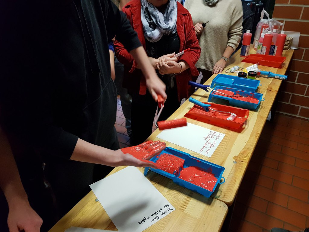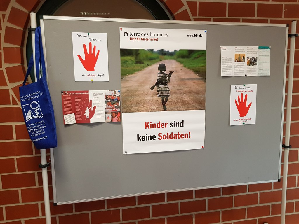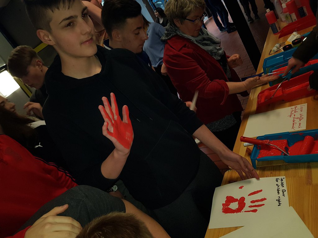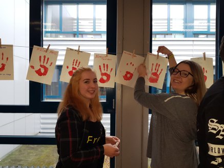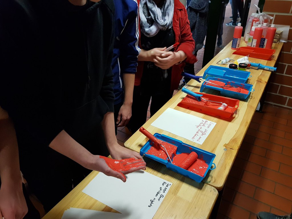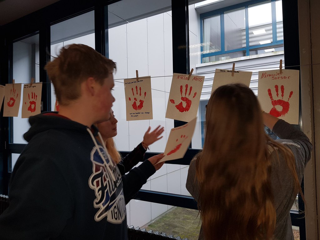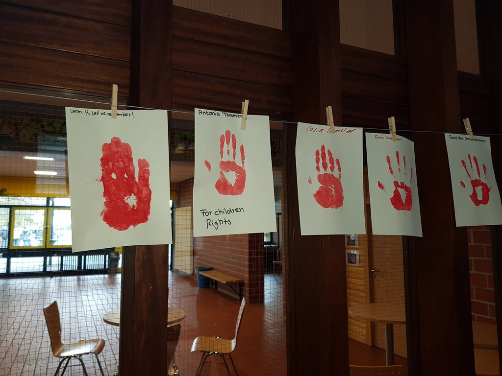 Im Anschluss oder zwischendurch konnten nicht nur die 10. Klassen, sondern alle Schülerinnen und Schüler einen roten Handabdruck auf einem Papier anfertigen und mit einem persönlichen Statement gegen Kindersoldaten und ihrem Namen versehen. Schon im Jahr 2009 haben Kinder aus ganz Deutschland über 130.000 rote Handabdrücke gesammelt und dem damaligen Bundespräsidenten Horst Köhler in Berlin zugestellt - als Zeichen, dass die Politik Einfluss nehmen muss, um die Anzahl der Kindersoldaten zu reduzieren oder traumatisierten Kindern Hilfestellung zu leisten.