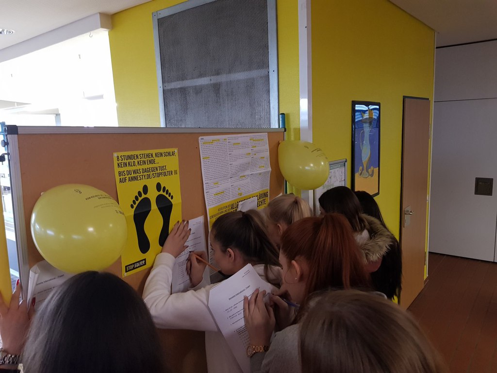 Es erstreckte sich über drei Schulstunden. In der ersten Stunde wurde eine Filmdokumentation zum Thema "Kindersoldaten" gezeigt, die zweite Stunde wurde dadurch bestimmt, dass sich die Schüler an extra aufgebauten Ständen von UNICEF, Amnesty International und terres des hommes zum Thema Kindersoldaten und weiteren Themen der Organisationen an einem auszufüllenden Fragebogen informieren konnten.