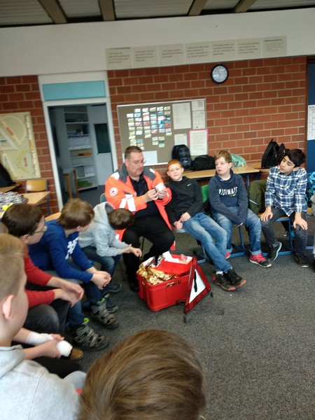 In der Projektwoche vom 19.03. bis zum 23.03.2018 hatten wir das Glück, dass Herr Kampeter, Sanitäter beim Roten Kreuz, Zeit hatte, den beiden fünften Klassen am Mittwoch einen Besuch abzustatten. Nachdem er zwei Stunden bei der 5a war, kam er dann in der 3. und 4. Stunde zu uns in die 5b. Die Schüler*innen hatten einen Stuhlkreis gebildet und alle fanden einen Platz.