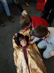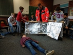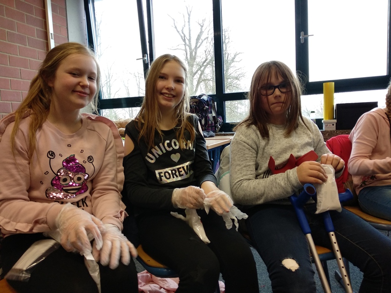 Mit großem Interesse haben die Schüler*innen verfolgt, wie man eine Folie unter eine/n Bewusstlosen legt – auch wenn sie/er etwas schwer ist - und wie man sie/ihn in die “Stabile Seitenlage“ bekommt. So könnte im Notfall auch ein/e 5. Klässler*in einer/m Bewusstlosen helfen und so vielleicht sogar ein Leben retten. Am Ende der Veranstaltung wurden noch jede Menge Verbände angelegt und “Kopfverletzungen“ mit Kompressen und Mullbinden geschützt.