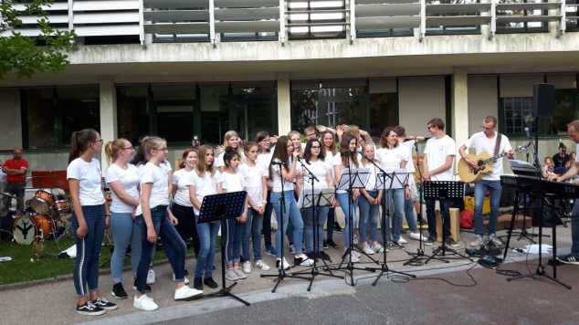 Wir sangen die Lieder „Count on me“, „Imagine“, „Love my life“, „Chöre“, „Let it go“, „Viva la vida“, „Über sieben Brücken“ und „Mr. Brightside“, die von Frieden, Freiheit, Liebe und Freundschaft handeln, um zu verdeutlichen, wie wichtig uns diese Themen sind. Unser Chor wurde von Herrn Linnemann am Klavier, Matthias an der Gitarre und Jonas am Cajon begleitet. Wir sangen die Lieder auf Englisch, Deutsch und Französisch. Drei ehemalige Schüler aus Bünde, die vor zwei Jahren schon begeistert teilnahmen, begleiteten uns.