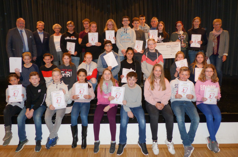 Kirchlengern. Die Erich Kästner-Gesamtschule ist seit 15 Jahren die größte angemeldete Gruppe beim Volkslauf „Gesund beginnt im Mund“. Grund genug für Schulleiterin Antje Stuke und Bürgermeister Rüdiger Meier den Schülerinnen und Schülern für ihre hervorragenden sportlichen Leistungen bei einer kleinen Feierstunde im Forum zu gratulieren. Der Bürgermeister überreichte einen Scheck für den allgemeinen Sportetat der Schule. Außerdem wurde u.a. ein weiteres Geldgeschenk vom Veranstalter „Gesund beginnt im Mund“ über Axel Zuleger für die größte angemeldete Gruppe (ca. 400 Schülerinnen, Schüler, Lehrerinnen und Lehrer) überreicht.