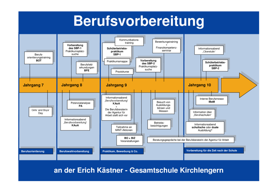 Die Berufswahlvorbereitung bildet einen Schwerpunkt in der Arbeit der höheren Klassen der Sekundarstufe I. Seit dem Schuljahr 2016 / 2017 arbeitet unsere Schule zusätzlich im landesweit einheitlich und effizient gestalteten Übergangssystem der schulischen Berufs- und Studienorientierung (KAoA – Kein Abschluss ohne Anschluss). Neu ist, dass ab der 8. Klasse alle Schülerinnen und Schüler im ersten Halbjahr an einer eintägigen Potenzialanalyse bei einem außerschulischen Bildungsträger teilnehmen und im zweiten Halbjahr an drei Berufsfelderkundungstagen unterschiedliche Berufsfelder erkunden. Zu diesem Zweck besuchen sie Betriebe der Region, um praktische Erfahrungen in der beruflichen Wirklichkeit zu sammeln. Eine zentrale Stellung nimmt auch das dreiwöchige Schülerbetriebspraktikum ein, das im ersten Halbjahr des 9. Schuljahres durchgeführt wird und einen zusätzlichen Einblick in die Arbeitswelt ermöglicht. Die Vor- und Nachbereitung des Praktikums erfolgt sowohl im Pflicht- und Wahlpflichtunterricht unserer Schule als auch durch Betriebserkundungen, spezielle Projekttage, eine eigene Praktikumsbroschüre und besondere Beratungsangebote. Dabei steht die Zusammenarbeit mit der Berufsberatung der Agentur für Arbeit im Mittelpunkt. Durch Besuche im Berufsinformationszentrum (BIZ) und ständige Kontakte mit der zuständigen Berufsberaterin sollen die Schülerinnen und Schüler befähigt werden, eine ihren Fähigkeiten und Interessen entsprechende Berufswahlentscheidung zu treffen. Zusätzlich bietet die Schule für alle Schülerinnen und Schüler die Teilnahme an einem speziellen Bewerbungstraining und an Informationsveranstaltungen der berufsbildenden Schulen sowie zur eigenen Oberstufe an. Parallel dazu erfolgt eine permanente individuelle Schullaufbahnberatung durch die Klassenleitungen, den Koordinator Berufswahlvorbereitung (in besonderen Sprechstunden) und durch die Abteilungsleiter.